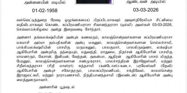 பிறப்பு 22/03/1945 இறப்பு 25/02/2026 திருமதி சிவமணி குமரகுரு வல்வெட்டித்துறை வித்தனை ஒழுங்கையை பிறப்பிடமாகவும், இலண்டன் குறொய்டனை வதிவிடமாகவும் கொண்ட திருமதி சிவமணி குமரகுரு 25.02.2026 அன்று இலண்டனில் காலமானர். அன்னார் குமரகுரு அவர்களின் அன்பு மனைவியும், காலஞ்சென்ற ஸ்ரீஸ்கந்தராஜா, காந்திமதி அம்மா தம்பதிகளின் மூத்த மகளும் ,பொலிகண்டிச் செர்ந்த காலஞ்சென்ற சிதம்பரப்பிள்ளை, இலட்சுமிப்பிள்ளை தம்பதியினரின் அன்பு மருமகளும் , பாலகிருஷ்ணன் ( கனடா ) ,தயாநிதி, கிருஷ்ணகுமார், புனிதவதி (இலண்டன்) ஆகியோரின் அன்புத் தாயாரும் ,சசிரேனுகா (கனடா), இராமச்சந்திரன், ரஜிதா, ஜெயசிங்கம் (அப்பர்), இலண்டன் ஆகியோரின் அன்பு மாமியாரும், காலஞ்சென்ற சந்திரலிங்கம் வசந்தாதேவி ( இலண்டன் ,இந்திரலிங்கம் (கனடா) ஆகியோரின் பாசமிகு சகோதரியும் , காலஞ்சென்ற சிவானந்தவேல் ,யோகராணியின் (கனடா) மைத்துனிதுயும், கமலகுமாரி (கனடா), இராஜகுமார் ,தயாளகுமாரி (இலண்டன்), சிறிக்குமார் (ஜேர்மனி ) பெரிய தாயாரும், தனபாலன் (கனடா), நொயலா ,தாயுமானவர் ,சந்திரிகா ஆகியோரின் பெரிய மாமியாரும், பிரசாந் , பிரதாப் பி,ரவீனின் அன்பு அத்தை, (குண்டுமாமி) டினேஷ் ,திரிஷா, ரக்ஷனா மதுமிதா , அபிநயா ,பிரபாகரன் ஆகியோரின் அன்பு அப்பாச்சியும் , சத்தியா ,,கிஷோர், சுவேதா துர்க்கா, துவாரகா, கரிகரன் ,கலையரசி மற்றும் ஆகிசன் ,மகிந்தன்(மயு), வினோ ஆகியோரின் அம்மம்மாவும் , விஜய் ,வினோத் ,வர்சினி ,ரோகினி ,வாசினி ,வினுசனின் பெரியம்மாவும், இனிஷா லூக்கா ,ரிசிகா, ரியாசனின் பெரியம்மாச்சியும் , அக் ஷந்த் ,நேஹவின், பாசமிகு பூட்டியுமாவார். அன்னாரின் கிரியைகள் விபரம் 08 .03.2026 ஞாயிற்றுக்கிழமை காலை 10 மணி தொடக்கம் மதியம் 12.30 மணி வரைக்கும் கீழ் வரும் முகவரியில் ஈமக்கிரியைகள் நடைபெறும் Tooting and MitchamCommunty Sports Club., Campus SocietyStadiam, BishopsFord Road,Morden, Surrey, SM4 6BF பின்னர் மதியம் 1.30 மணிக்கு கீழ் வரும் முகவரியில் தகனக்கிரியை நடைபெறும் South London Crematorium, Rowan…