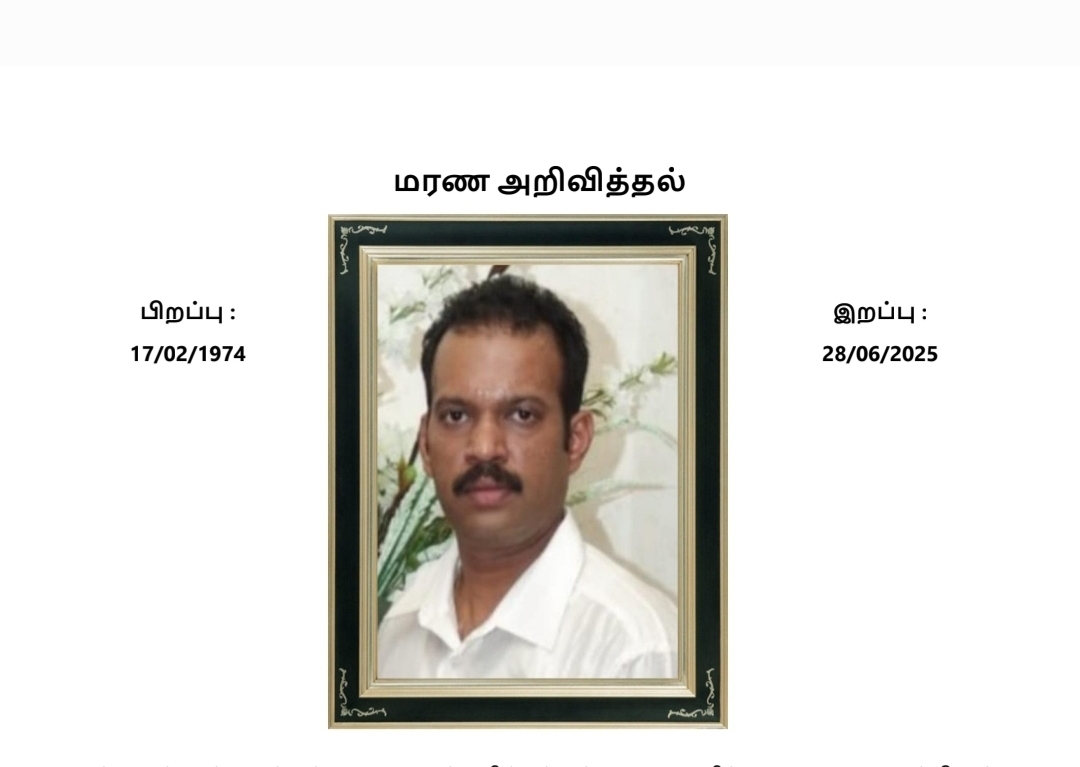 08.09.2022 அன்று அமரத்துவம் அடைந்த எங்கள் குடும்பத்தலைவரின் செய்தி கேட்டு ஆறுதல் கூறியவர்களுக்கும் கண்ணீர் பதாகைகள் வைத்த கடற்தொழிலாளர்கள் சங்கம், கழகங்கள்,இணைய வாயிலாக கண்ணீர் அஞ்சலி செலுத்திய வர்களுக்கும் இணையத்தின் மூலம் அறிவித்தலை பிரசுரித்தவர்களுக்கும் நேரில் வந்து உதவி செய்தவர்களுக்கும் நன்றியை தெரிவிப்பதோடு நிகழும் 07.10.2022 அன்று காலை ஊரணி கிரியை மண்டபத்தில் நடைபெறும் அந்தியேட்டிக் கிரியைகளிலும் அதனைத் தொடர்ந்து , வீட்டில் நடைபெறும் சபண்டிகரண கிரியை களிலும் பங்கு பெறுவதோடு மதிய போசனத்திலும் கலந்து கொள்ளுமாறு அனைவரையும் அன்புடன் அழைக்கிறோம்.