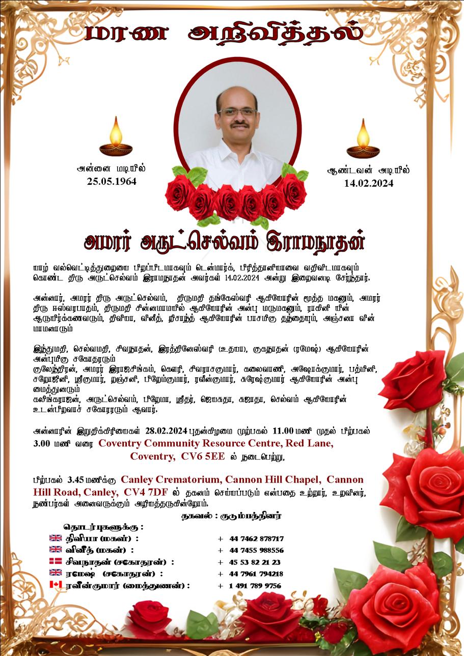 யாழ். வல்வெட்டித்துறையைப் பிறப்பிடமாகவும், டென்மார்க், பிரித்தானியாவை வசிப்பிடமாகவும் கொண்ட திரு. அருட்செல்வம் இராமநாதன் அவர்கள் 14-02-2024 புதன்கிழமை அன்று இயற்கை எய்தினார்.