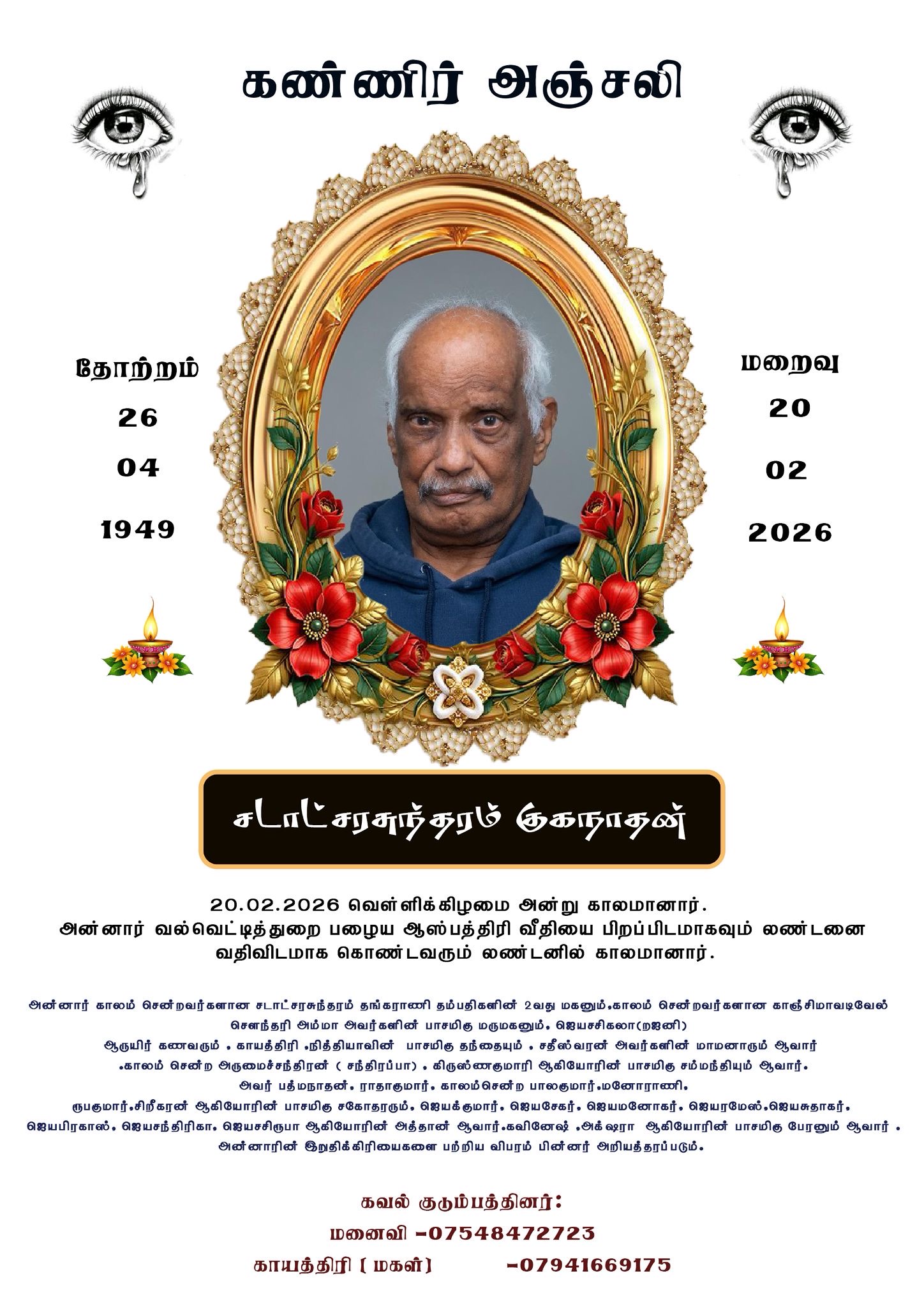 - இறுதிகிரியை பற்றிய அறிவித்தல் அமரர் சடாட் சரசுந்தரம் குகநாதன்